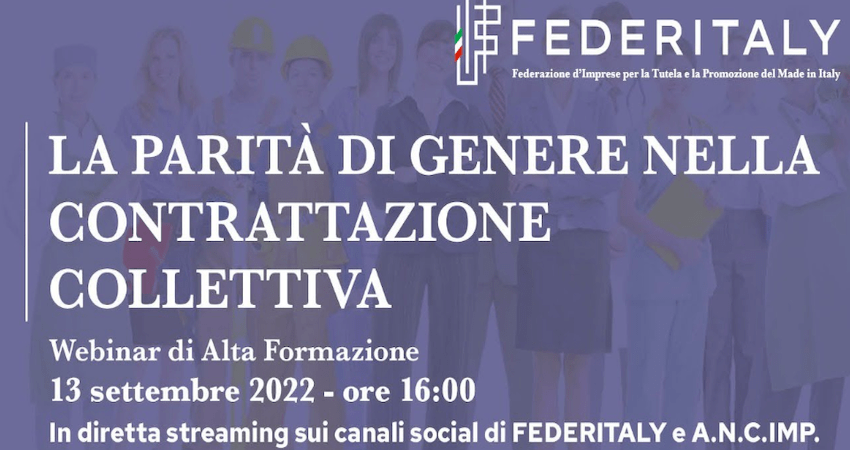 FEDERITALY e ANCIMP ITALIA, organizzano, per la giornata del 13 settembre 2022, il webinar di Alta Formazione dal titolo “La parità di genere nella contrattazione collettiva“.